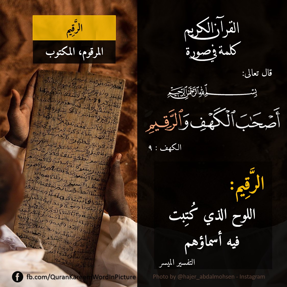 كلمة "الرَّقِيم" سورة الكهف - الآية 9 قال الله تعالى: {أَمْ حَسِبْتَ أَنَّ أَصْحَابَ الْكَهْفِ وَالرَّقِيمِ كَانُوا مِنْ آيَاتِنَا عَجَبًا (9)} التفسير الميسر: لا تظن -أيها الرسول- أن قصة أصحاب الكهف واللوح الذي كُتِبت فيه أسماؤهم من آياتنا عجيبة وغريبة؛ فإن خلق السموات والأرض وما فيهما أعجب من ذلك. |